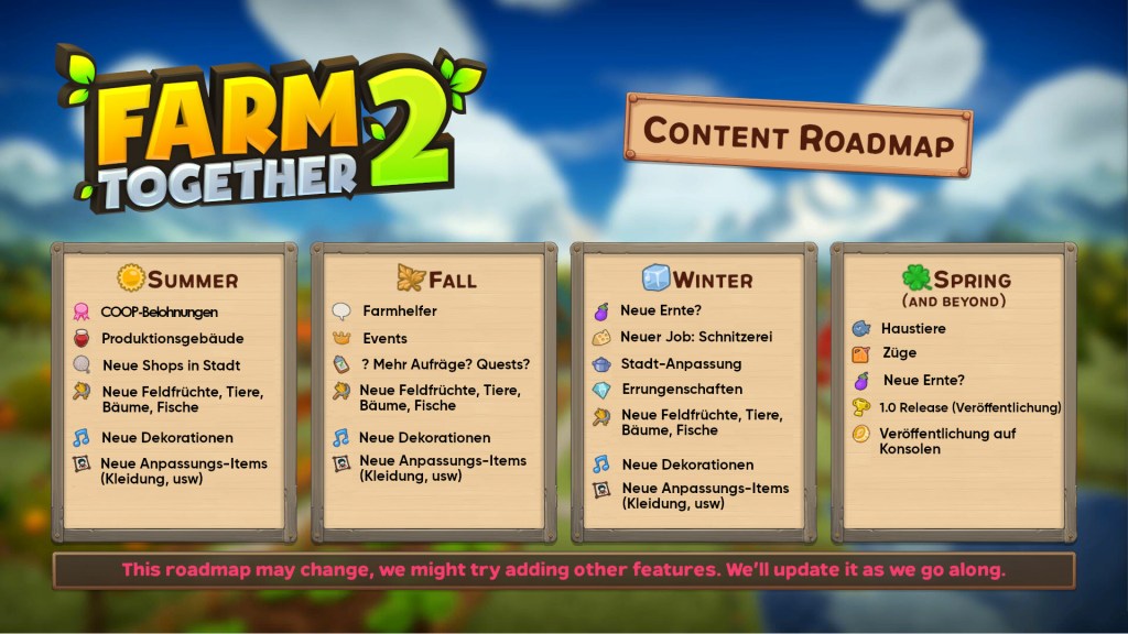 Laut der veröffentlichten Roadmap werden noch einige tolle Erweiterungen, wie DLCs, Haustiere, Events und sogar NPC-Besucher auf der Farm ins Spiel eingebaut. Es wurde sogar von einem Pferd gesprochen, mit dem man später über die Farm reiten kann.