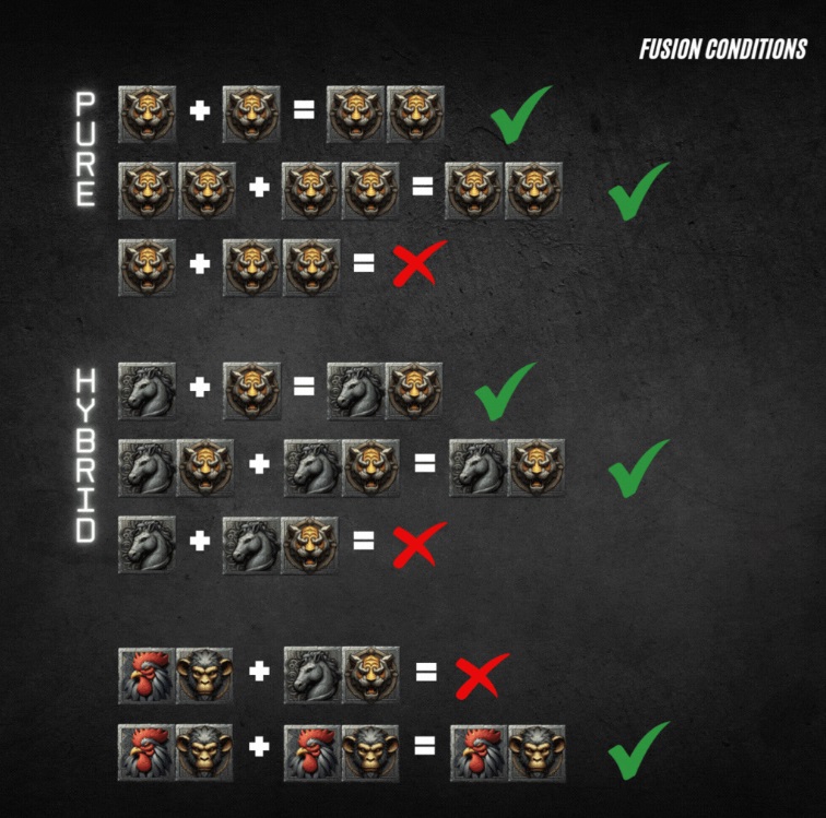 Die Zahlen oben stehen für die Symbole auf den Karten links und rechts oben. Wenn man nun zwei Karten des gleichen Symbols (zB. Hund) hat, können sie fusionieren. Zwei Karten mit 2 Symbolen (es müssen links und rechts die gleichen Symbole vorhanden sein) können fusionieren.